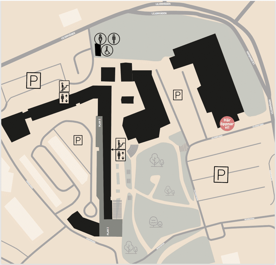 Buss: Hållplats ”Lidingö Centrum”, gå bakom stadshuset, ner över parkeringen och till kortsidan av huset bakom centrum.